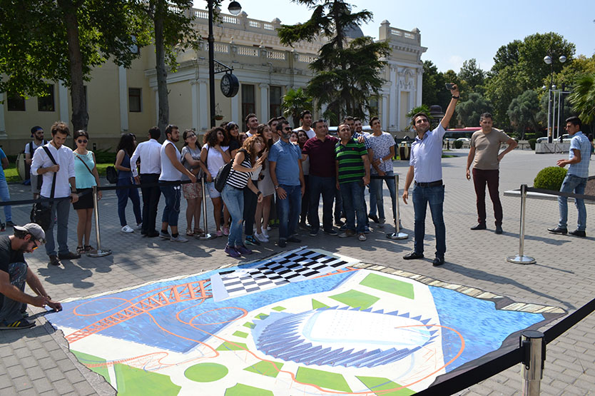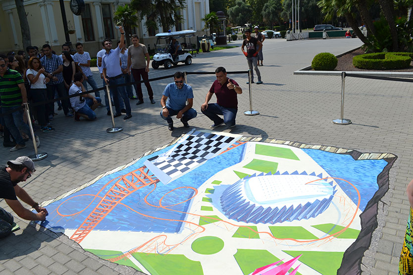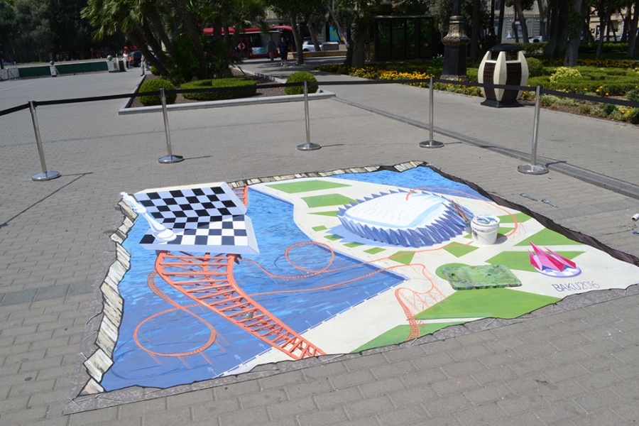 It took Alex three days to complete the 3D image dedicated to the 42nd World Chess Olympiad. The image has caused a great deal of interest among the people of Baku. Speaking to the press service of the Baku Chess Olympiad, Alex Maksiov said, “I am pleased to come to Azerbaijan. When I received the invitation from the Baku Chess Olympiad Operating Committee, I thought of creating something interesting. You can see the venue of the Olympiad, Crystal Hall, and a chess board on my image. The chess board descends into the playing area on an American roller coaster. The idea behind this is that the attention of the whole world will be focused on Crystal Hall. The world’s best players will be gathered in Baku. I am inviting everyone to come to the boulevard and take pictures of the 3D image. 3D is a reflection of reality. This is my second work in Baku. I also attended a 3D street-art festival outside the Maiden Tower in Baku two years ago.