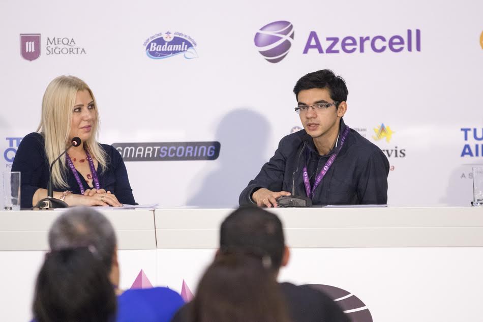 Anish Giri, top board of the Netherlands team, joined Susan Polgar for a press conference right after his game against Michael Adams from England was concluded drawn.
