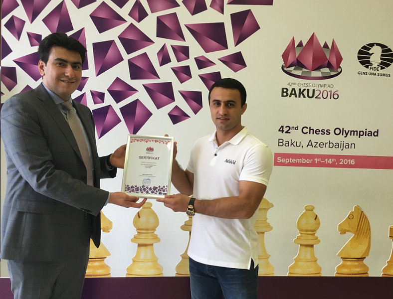 The name of another star ambassador for the World Chess Olympiad in Baku has been revealed. It is Olympic champion and two-time world champion Farid Mansurov. A special certificate has been presented to the athlete by the executive director of the Baku Chess Olympiad Operating Committee, Murad Iskandarli.