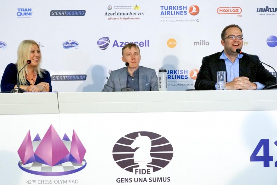The most significant result of the 4th round in the Open section undoubtedly was the victory of the Ukrainian team over the top seeds, Russia, by 2.5-1.5. Grandmasters Ruslan Ponomariov (a former FIDE World Champion, who beat Tomashevsky) and Pavel Eljanov (who drew with former World Champion Kramnik) – the last two games of the match to finish – joined Susan Polgar for a press conference.