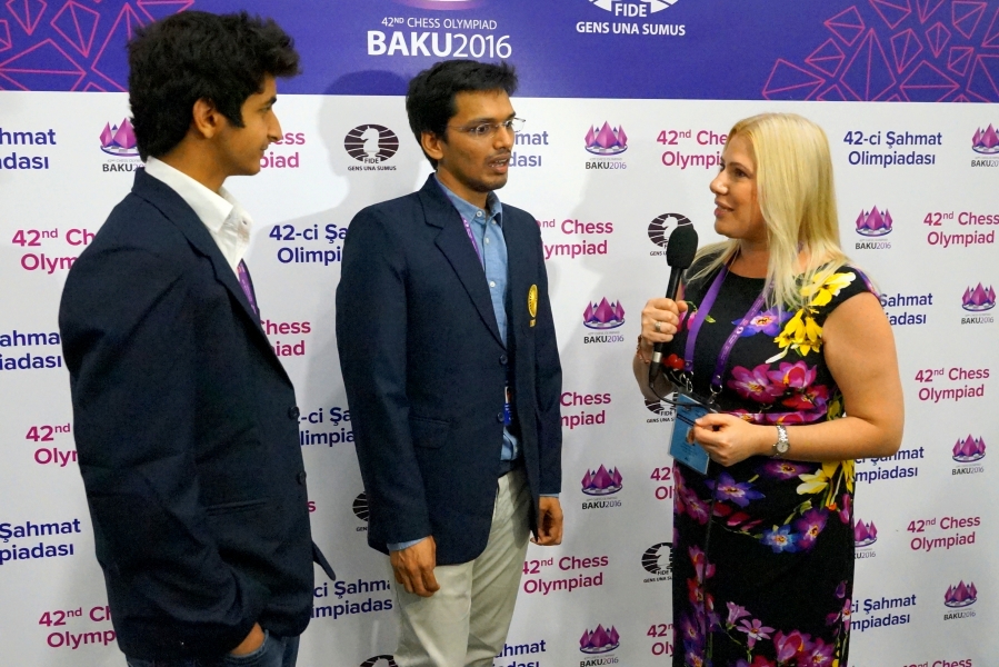Indian Grandmasters Pentala Harikrishna and Vidit Santosh Gujrathi won their games on boards 1 & 3 in the key match against Azerbaijan, both with the black pieces. Susan Polgar seized the opportunity for a few words with two very happy guys!