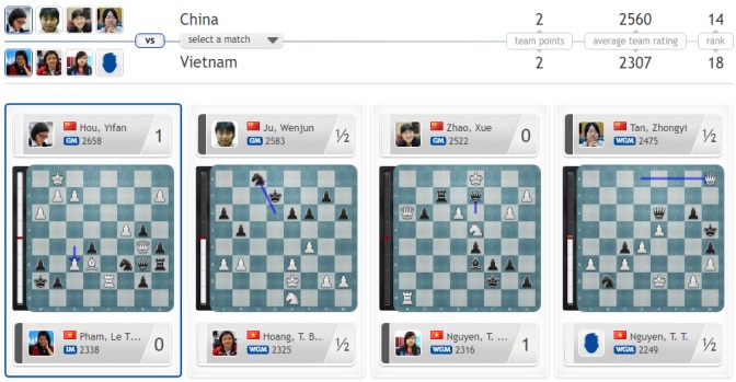 ou Yifan looked raring to go, utterly paralysing her opponent at the end of the game, but Zhao Xue suffered the indignity of getting mated by Thi Mai Hung Nguyen. As Niclas noted in his video, the match was closer to a Vietnamese win than to a Chinese one.