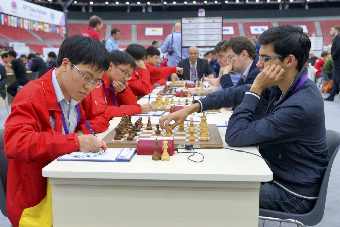 Anish Giri moved to 3/3, despite his Vietnamese opponent Le Quang Liem being absolutely no pushover | photo: David Llada, Baku Chess Olympiad